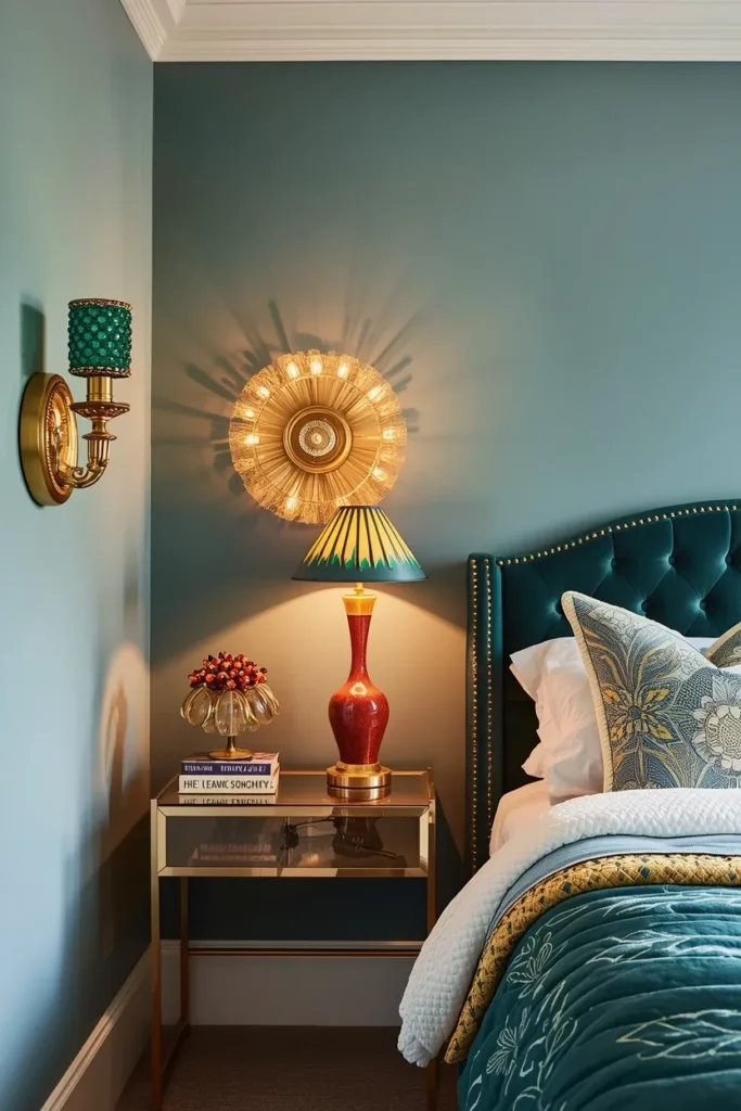 Lighting is a key element in a maximalist bedroom. Opt for a mix of lighting sources, such as a crystal chandelier, colorful table lamps, and wall sconces with intricate designs. Incorporating energy-efficient lighting options can add to the room’s sustainability while maintaining the desired ambiance.