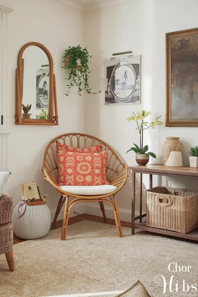 Transform a corner of your living room into a vintage nook with a collection of eclectic pieces. This setup features a mix of a floral-painted mirror, vintage figurines, a wicker chair, and other charming artifacts. By adding such unique and personal touches, you create a cozy and inviting space that exudes personality and nostalgia. Add various textures, colors, and styles to achieve a truly eclectic and captivating living area.