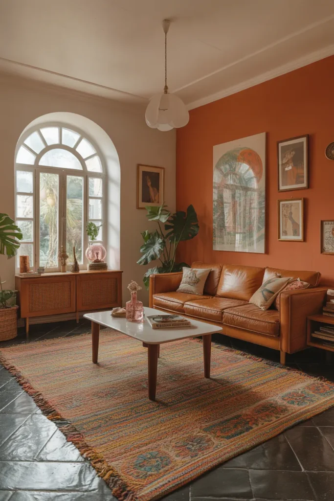 This living room bursts with vibrant colors, creating a lively and eclectic vintage atmosphere. The deep green walls make the perfect backdrop for the bright orange couch, adorned with quirky, colorful pillows. Focus on a bold wall color and contrasting vibrant furniture. Add unique decorative items and art pieces that reflect your personality.
