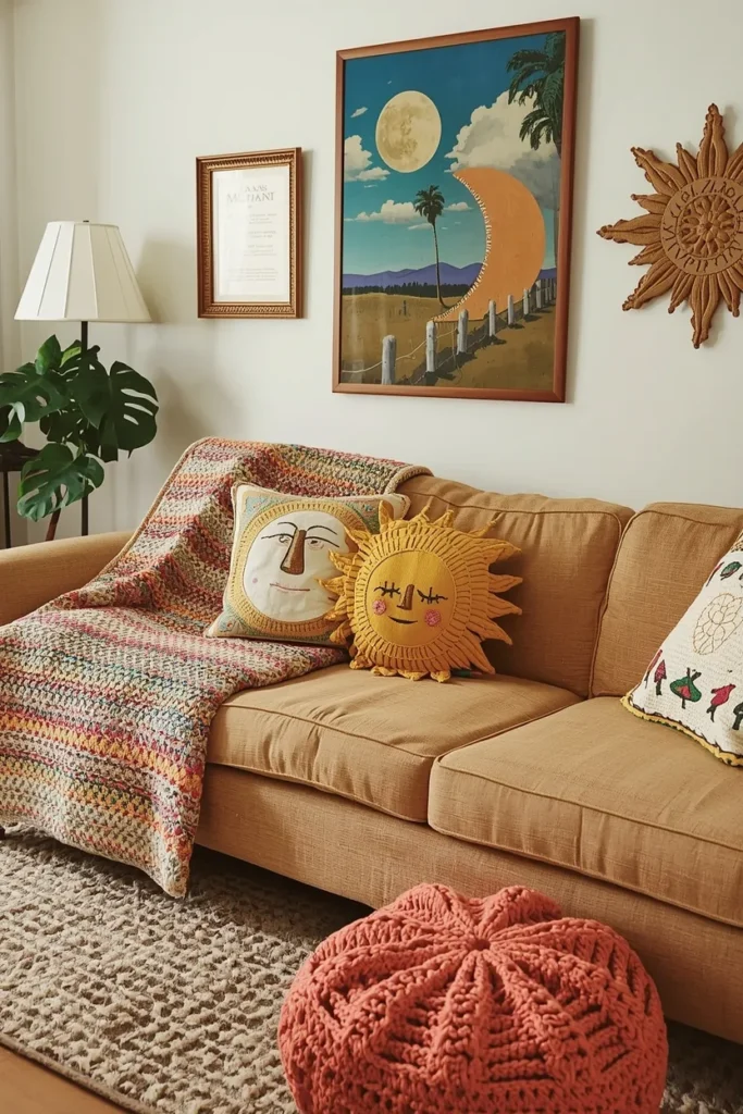 This living room captures a whimsical charm with its cozy crochet blanket draped over the sofa and playful moon and sun pillows. The eclectic mix of textures and colors adds warmth and personality to the space. Add handmade crochet pieces and fun, thematic pillows. These elements infuse the room with a nostalgic, cozy vibe that celebrates creativity and individuality, perfect for a vintage eclectic theme.