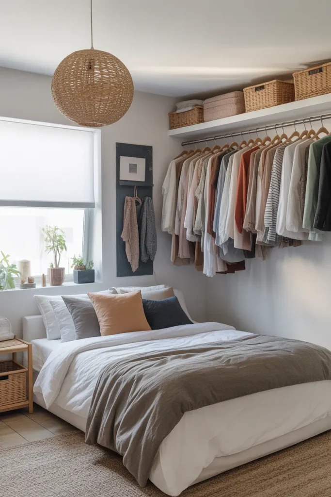 Install rods on the wall for hanging clothes if floor space is limited. It’s a minimalist solution for small rooms.
