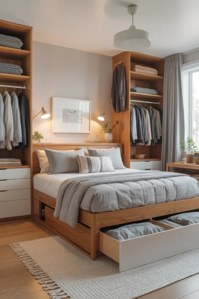 Opt for furniture like a bed with built-in drawers or a bench with storage underneath to maximize your bedroom space.