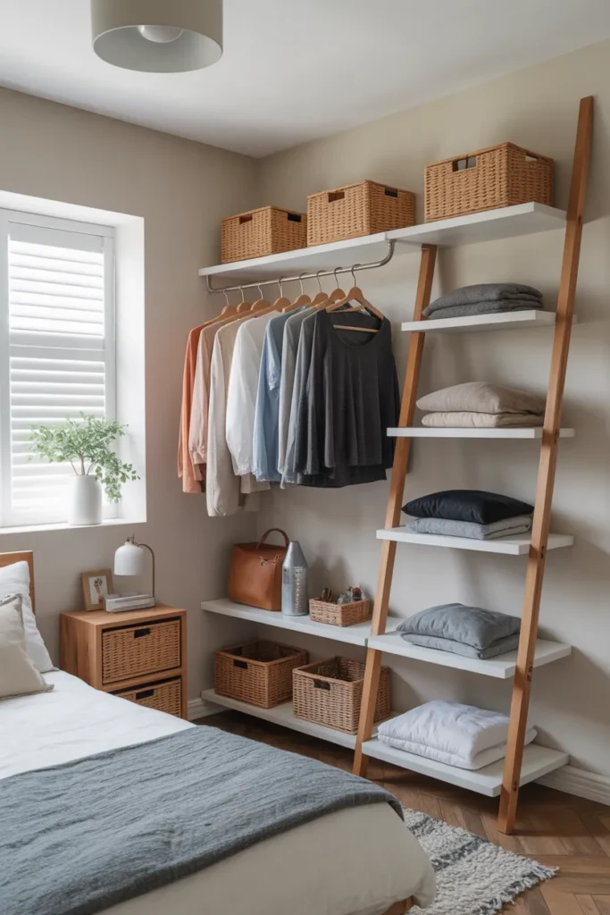 A leaning ladder shelf adds storage without taking up much space. Use it to hang clothes or place folded items.