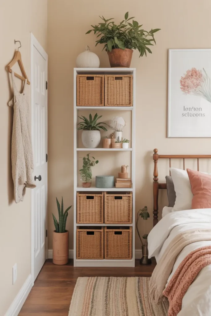 Place decorative baskets on shelves or under furniture to store clothes or accessories while adding style to the room.