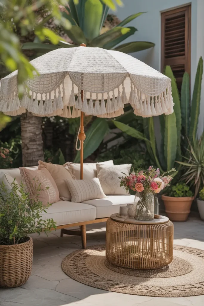 A boho patio is incomplete without a chic, tassel-trimmed umbrella. They’re functional and fabulous, providing shade while doubling as a statement piece.