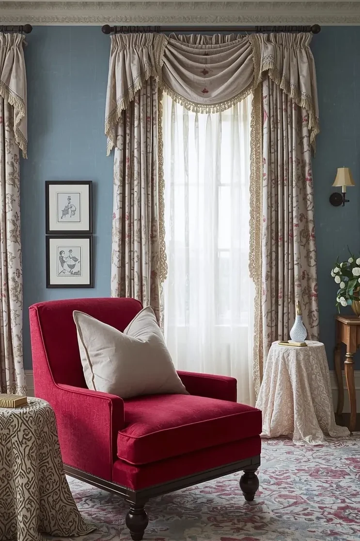 Swap modern textiles for fabrics that feel decadent. Add velvet throw pillows, brocade drapes, or lace-trimmed table runners. Even a single velvet armchair or lace-draped side table can transport your space into a castlecore fantasy land.