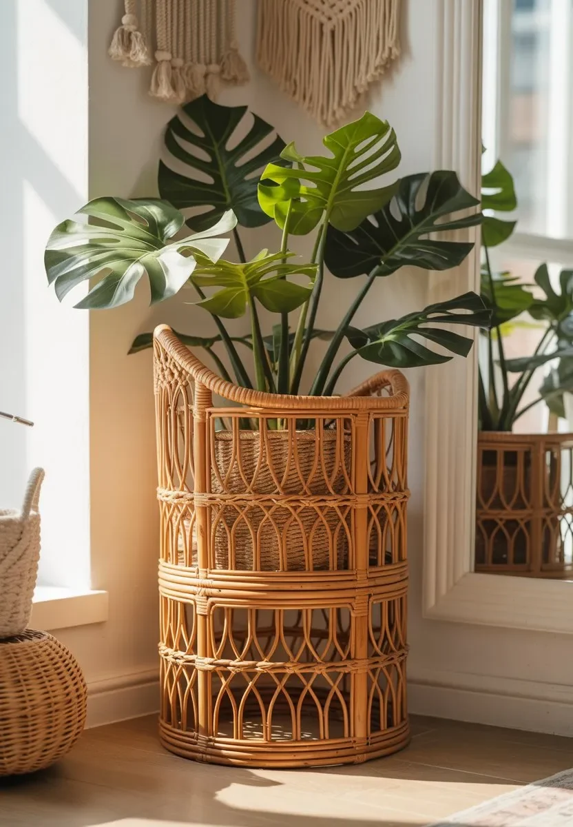 2. The Boho Beauty: Rattan or Woven Basket Stand