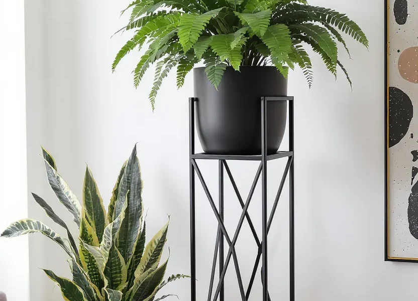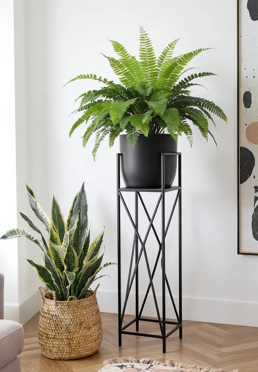 Sculptural, eye-catching stands (think matte black, geometric patterns, maybe a brass accent) turn a humble fern into a modern art installation. Often raised, so they permit storage space below—double win!