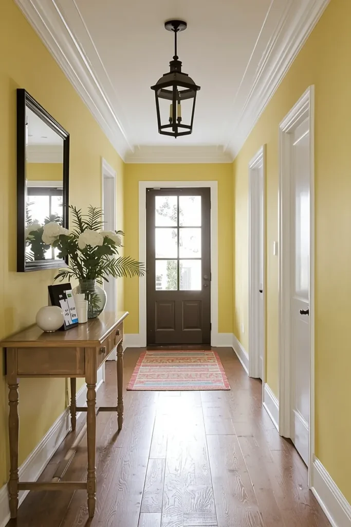 For a burst of energy, consider bright yellow. This cheerful color will brighten your hallway and add a welcoming feel. Use it with white accents to balance the vibrancy.