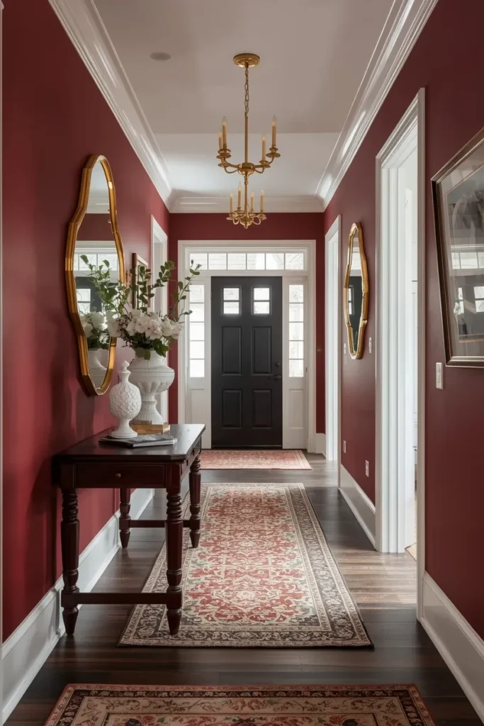 For a rich and luxurious hallway, deep burgundy is an excellent choice. It pairs beautifully with gold mirrors and chandeliers for a regal look.