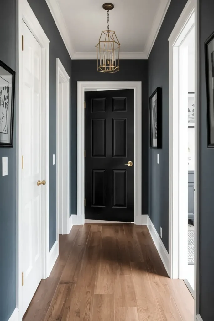 Slate blue is an excellent choice if you’re aiming for a moody yet sophisticated hallway. It pairs well with brass hardware and dark wood floors.
