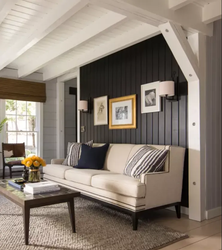 Vertical shiplap painted in a deep black adds instant depth and contrast, especially in a room with an otherwise neutral palette. It grounds the space visually and creates the perfect backdrop for an elegant gallery wall. Rustic, modern, and sophisticated all at once — this is one of those designs that feels bold now and timeless later.