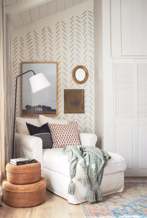 Instead of highlighting the main wall, this living room turns an overlooked corner into a cozy reading nook. Soft gray-and-white wallpaper wraps the space, anchoring a comfortable chaise lounge, a warm floor lamp, and a thoughtfully arranged gallery wall. What was once an empty corner now feels purposeful — a place you actually want to curl up with a book and forget your phone exists.