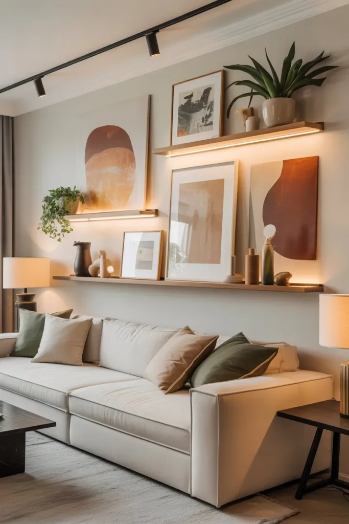 Why choose one idea when you can combine a few? Pair floating shelves with art, plants, and lighting for a layered, dynamic look that’s totally you.