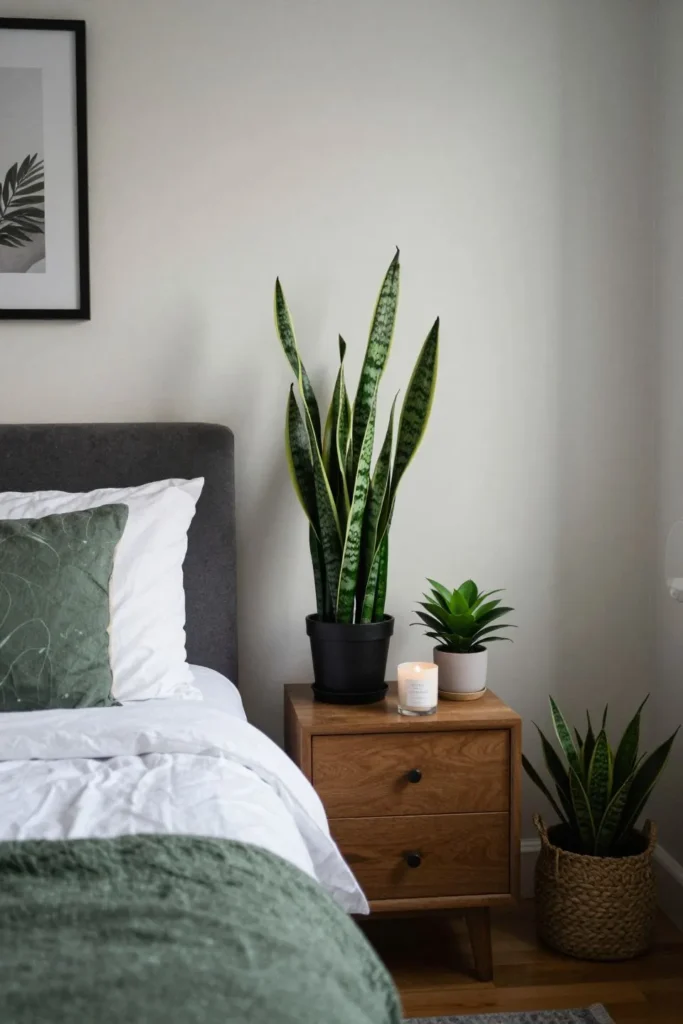 Snake plants and peace lilies are perfect here — low maintenance and calming.