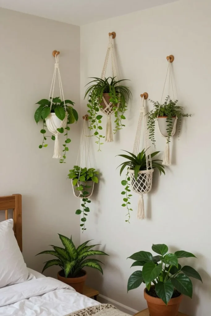 Macramé hangers or simple wall hooks work beautifully — just make sure they’re secure.