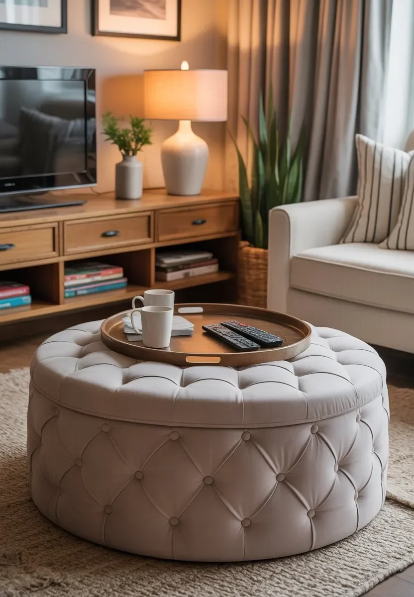 A tufted ottoman can double as seating for extra guests, plus tray-table for snacks.
