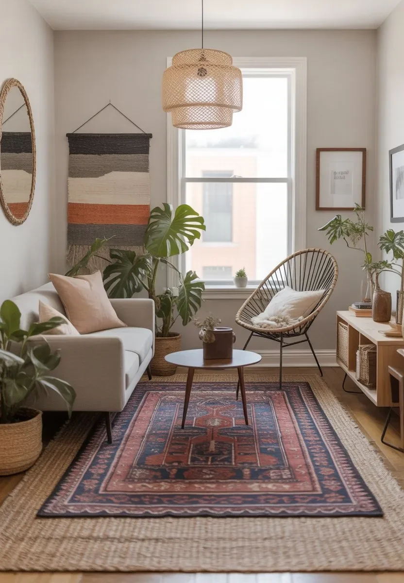 One low-pile neutral rug + a smaller, patterned accent rug = best of both worlds. Layering creates visual zones, even in a one-room apartment.