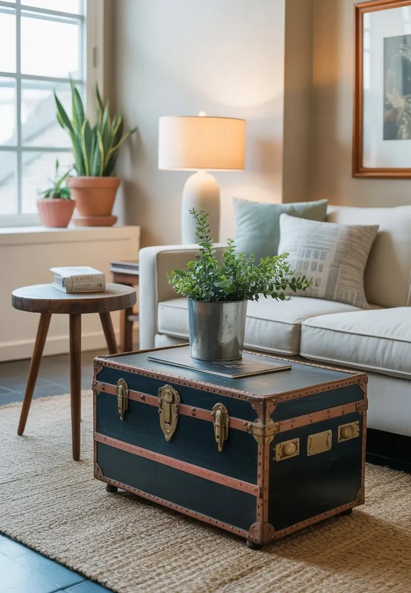 Choose something with character—a vintage trunk, a round table, even a repurposed art stool. Bonus points: tables with hidden storage.