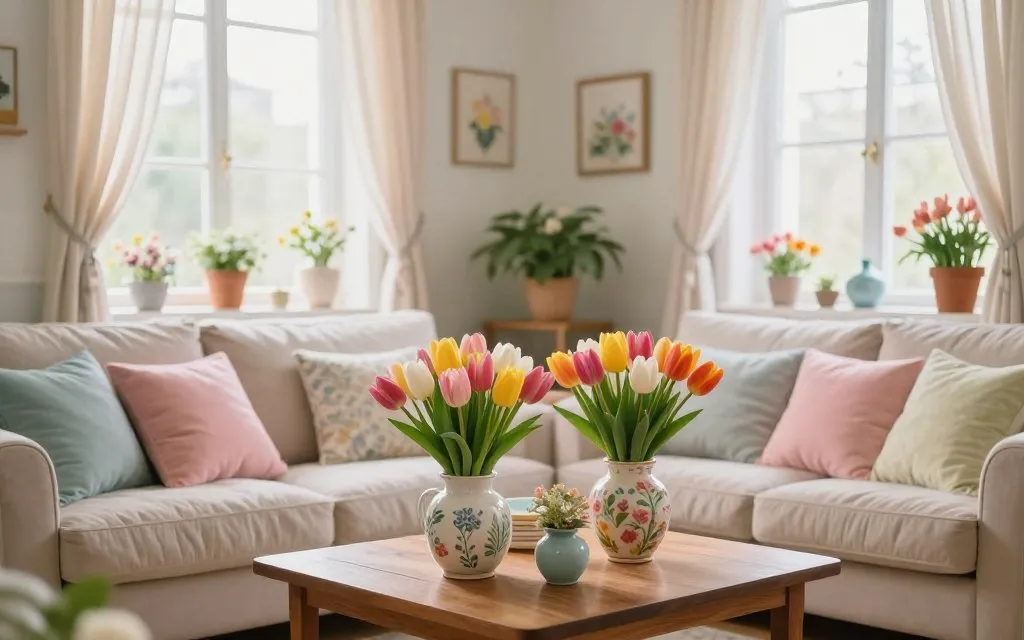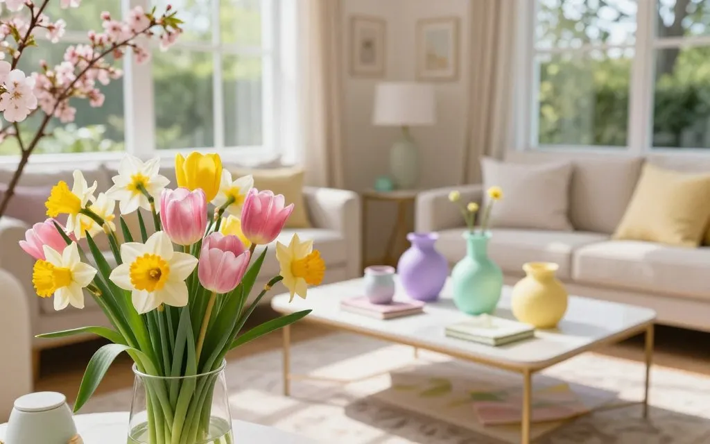 Spring flower arrangements brighten tabletops without fuss. Use tulips, ranunculus, daffodils, hyacinths, or peonies as focal blooms. For a clean look, pair a single flower type with abundant greenery.